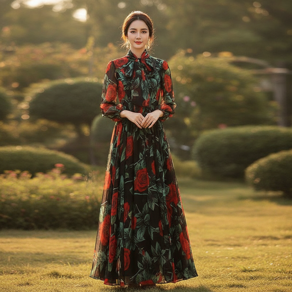 Dieses Chiffonkleid mit Bindekragen verkörpert zeitlose Eleganz – ein anmutiges Kleid, das Ihre Schönheit mit zarten Details, femininem Charme und müheloser Stilfertigkeit unterstreicht. Der weiche Chiffonstoff, der charmante Bindekragen und die fließende Silhouette machen es zum perfekten Begleiter für besondere Anlässe und Abendveranstaltungen und verleihen Ihnen gleichzeitig die raffinierte Eleganz, die Sie schätzen.