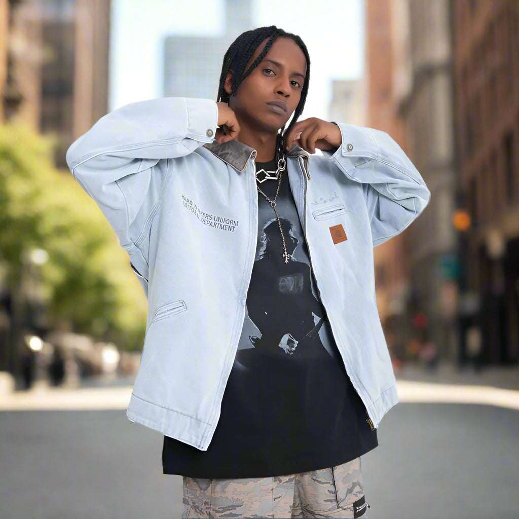 Crafted from durable denim, this men's jacket features a zip-up closure and loose fit for a casual and comfortable look. Perfect for layering or as a statement piece, this jacket is a versatile addition to any wardrobe.