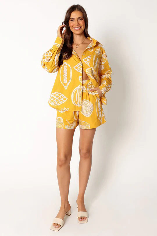 Upgrade your summer wardrobe with our Women's Casual Fruit Printed Shirt and Shorts Outfit Set. Made with a soft and breathable fabric, this set is perfect for any casual occasion.